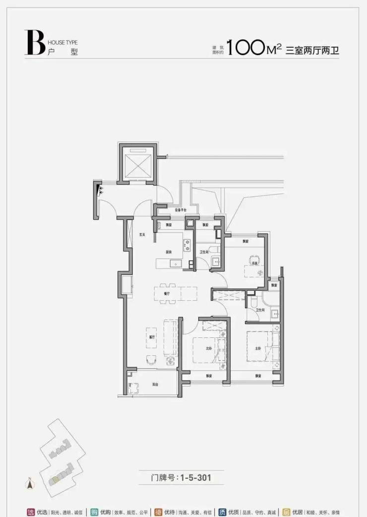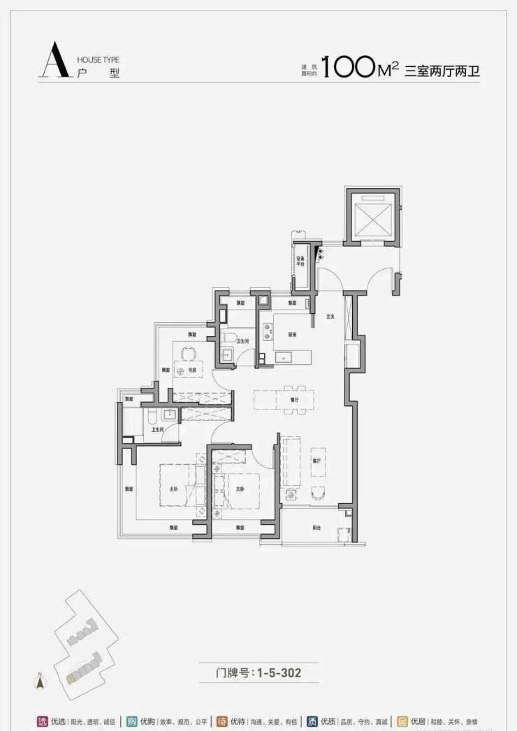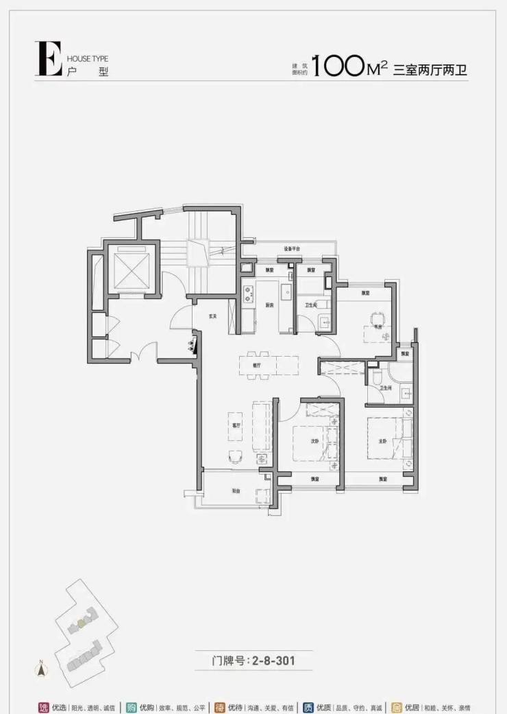 约100㎡三房两厅两卫:内环稀缺百平米三房,入门改善爆款户型,堪称“内环低门槛入驻首选”.户型方正通透,南北通透,三开间朝南,采光通风俱佳,搭配270°全玻璃幕墙转角飘窗(部分户型),拓宽视野边界,将公园美景与城市风光引入室内;动静分离设计,客餐厅与阳台一线贯通,提升空间开阔感,满足日常家庭社交、聚餐等需求;两个卫生间设计,干湿分离,避免家人共用卫生间的尴尬,提升晨间使用效率,适配三口之家的居住需求,同时,作为市中心最后一批百平米三房,性价比突出,直接为购房者节省100多万购房成本,稀缺性拉满.
