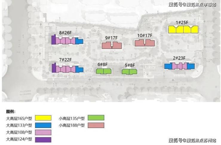 5#、6#总高8层,无架空层,其余楼栋1层均有架空;9#、10#总高17F,其余楼栋总高22-26F;