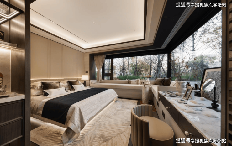 其中主卧的270°转角飘窗就有约5.7m²,通过与外立面的结合,直接做了梳妆台和储物柜,拓展了飘窗的实用性。