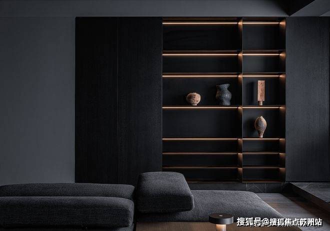黑色所代表的并非是绝望和深渊,黑色在这个室内象征着宁静和整洁,以高度的统一感创造空间的和谐,打造了高品质的居所,规整的沙发、地毯以及嵌入墙体的壁龛,都汇集于此,用品质诉说着家的整洁。