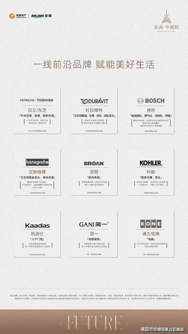 精选国际一线品牌:全屋配置 简一瓷砖百朗新风系统(或同等品牌); 日立或东芝(或同等品牌) 中央空调、地暖以及厨房空调;