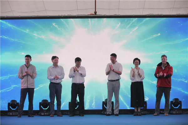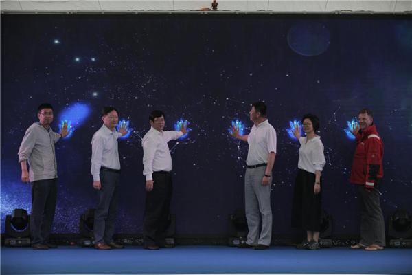 领导及来宾跟随着主持人的倒数声按下大屏幕手印,