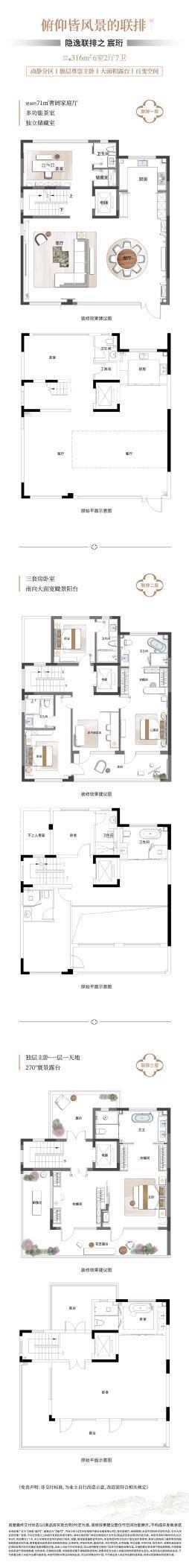 项目里有三种不同类型的住宅:7栋3层的联排别墅,面积在285到315平方米之间,总共31套;3栋5+1层的叠墅,下叠220平方米,中叠和上叠都是260平方米,总共45套;还有2栋11层的四代宅洋房,中间户157平方米,边户190平方米,总共82套。