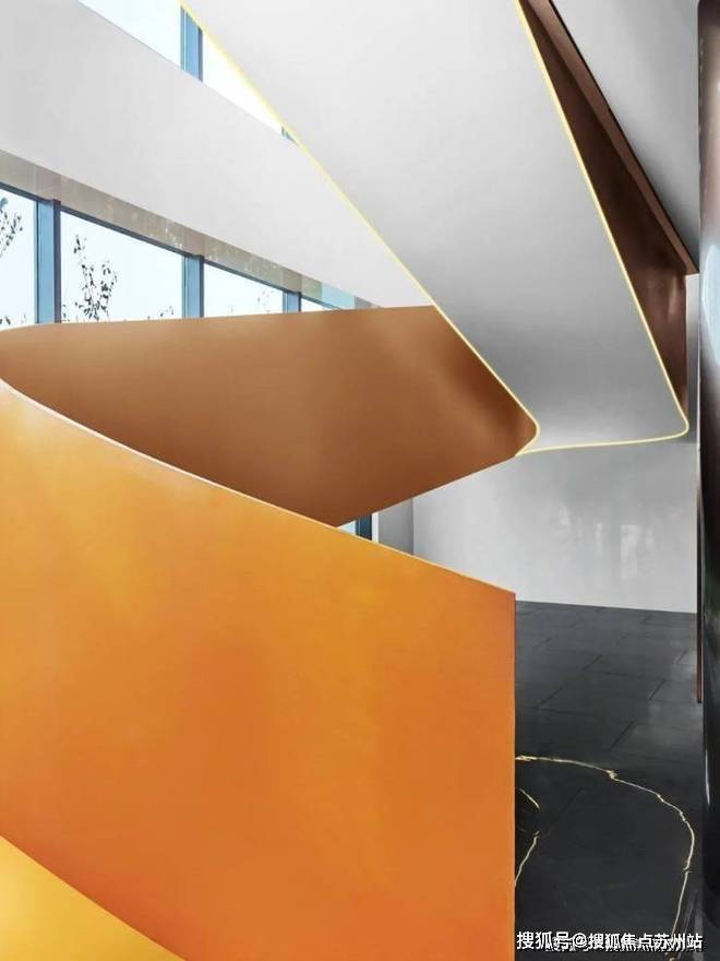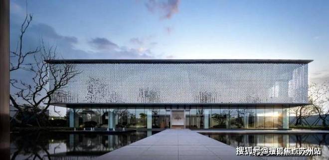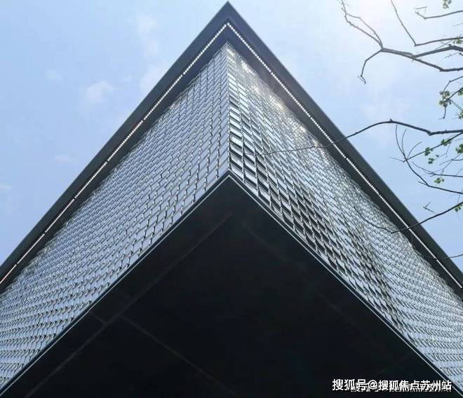 示范区主立面以银白不锈钢风动片为主,辅以珍珠白色铝板和浅灰色玻璃.徐风吹过,不锈钢片波动泛起涟漪,仿佛江南灵动的水系,勾勒出建筑独特的气质.