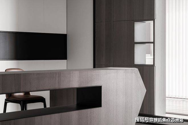 苏州爱情溪岸售楼处电话☎:400-8828-814(售楼处预约看房热线)餐边柜整体设计与客厅背景墙相呼应,采用黑白配色,大气又简约,将冰箱、蒸烤箱、茶水台纳入这个空间,功能齐全、塑造整体感的同时又增加了足够的收纳空间.