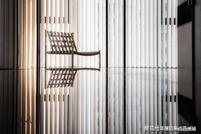 垂直百叶窗将透过大落地窗照进家中的光线均匀切开,营造出光影的效果,既保证了充足的光线又有效保证了隐私性.