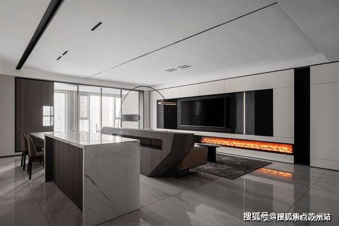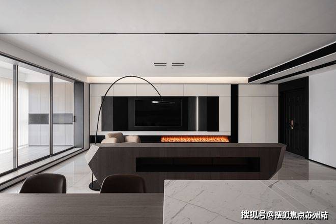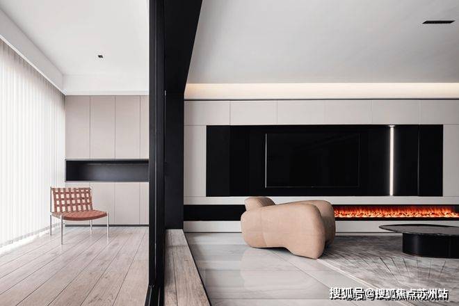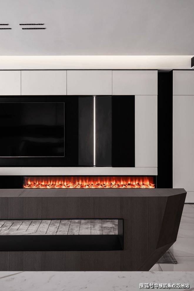 苏州爱情溪岸售楼处电话☎:400-8828-814(售楼处预约看房热线)电视背景墙以通顶的柜体来塑造,白色哑光面柜体将黑色电视机包围其中,与主色调黑白配色相吻合,中间内嵌灯带起到点睛之笔的作用.