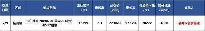 2024年7月9日,上海第三批次土拍中,北京城建与越秀地产组成的联合体以高达22.3亿元的价格成功竞得杨浦长白社区N090701单元201街坊H2-17地块(即领翠滨江),其成交的楼面价格定格在70272元/平方米,溢价率约17.12%,装修标准不低于4000元/㎡。