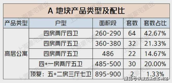 其中,A 地块高层公寓视野及地理位置均最佳, 户型以四房户型为主, 主力产品面积段为260-500 ㎡,私家电梯厅入户,礼仪性玄关,多套房设计。顶层设置豪华顶复套型,彰显尊贵及稀缺特性。