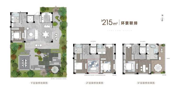 还有建面约170㎡的联排,性价比很高。一层有敞亮的客厅和餐厅,连接着私家院子;二层也是双套房设计,尊重每个家人的隐私;三层整个都是主卧空间,私密性极佳。对于首次换购大房子的家庭来说,这是一个非常理想的选项。