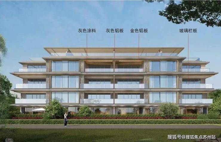 洋房外立面则是灰色涂料、灰色铝板、米白色仿石铝板和玻璃栏杆!