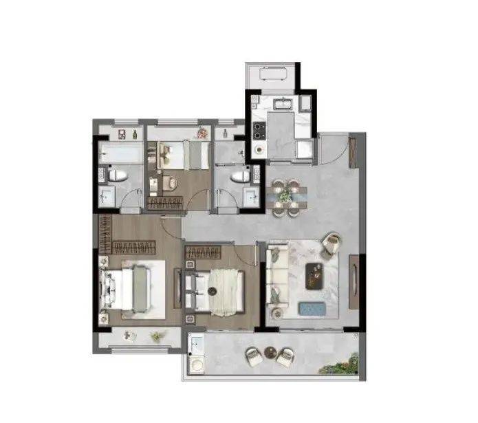 约105㎡三房:有两种格局,都是三开间朝南,阳光充足。有的户型是边户,视野更广。主卧带独立卫生间和衣帽间,U型厨房好用,双开间阳台特别敞亮。