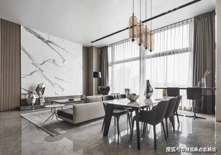 占据整体居所视觉重要的,是以鱼肚白大理石构成的客厅背景墙,线条明晰,行云流水,宛若破晓山涧,都市中突显的自然气息。