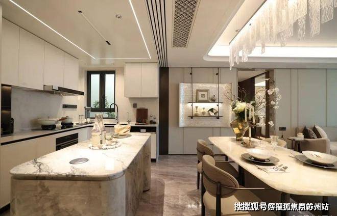 来到建面约112㎡3房2厅2卫样板房,设计主打海派风格,开放式厨房和西餐岛台,卫生间地面拼花,石材台面镀金龙头。标准的三开间户型,设计上将传统的过道改为餐厅空间,将公共区域做大了。
