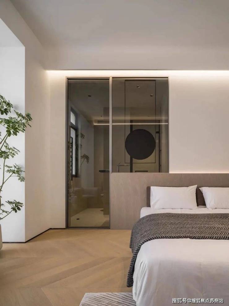 定制木饰面床头背景墙,木质触感温润更适合作为靠背。背后的洗手间也做了改动,将门旁边墙体拆除,同门一起改装为茶色玻璃,视觉上连通两个空间,更显通透敞阔。