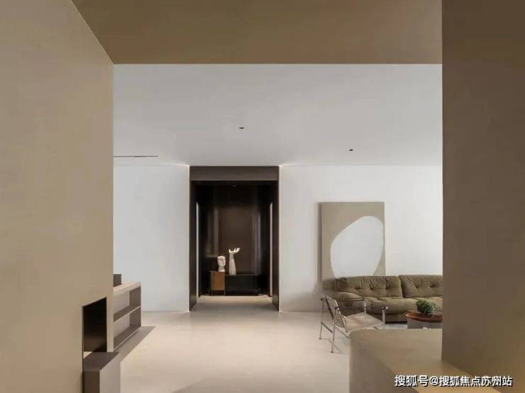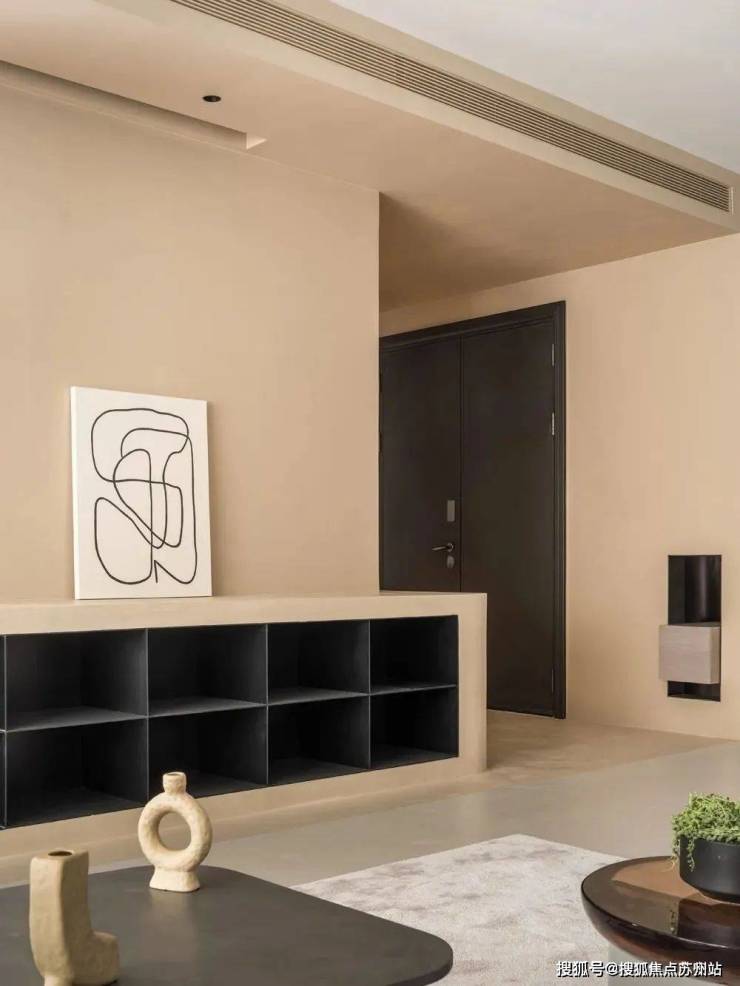 玄关与客厅之间采用不同色调微水泥,以视觉划分区域,形成空间感,同时于玄关处吊顶,藏起空调及各类管道,不影响客餐厅等高频率活动区域的层高视野,隐形加长出风口延伸至与墙面同宽,同吊顶融合一体,降低视觉存在感,更显简练。