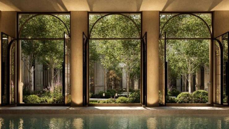 NO.8花园泳池波光潋滟处,拱形门窗外花影摇曳,一池春水将四季芳菲溶成流动的油画.