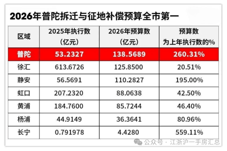其次,2026年普陀拆迁与征地补偿预算高达约138亿,全市最高.真金白银投入之下,普陀城市界面、市政配套将迎来新一轮大幅升级,区域发展全面提速.