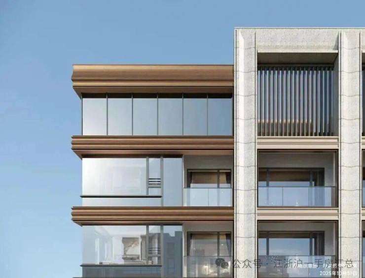 质感立面:采用石材+铝板组合,可视面均为古铜色金属铝板、米黄色铝板/石材,搭配边套270°大转角飘窗,从正面、侧面到背面,立面精致统一,颜值与质感双在线.
