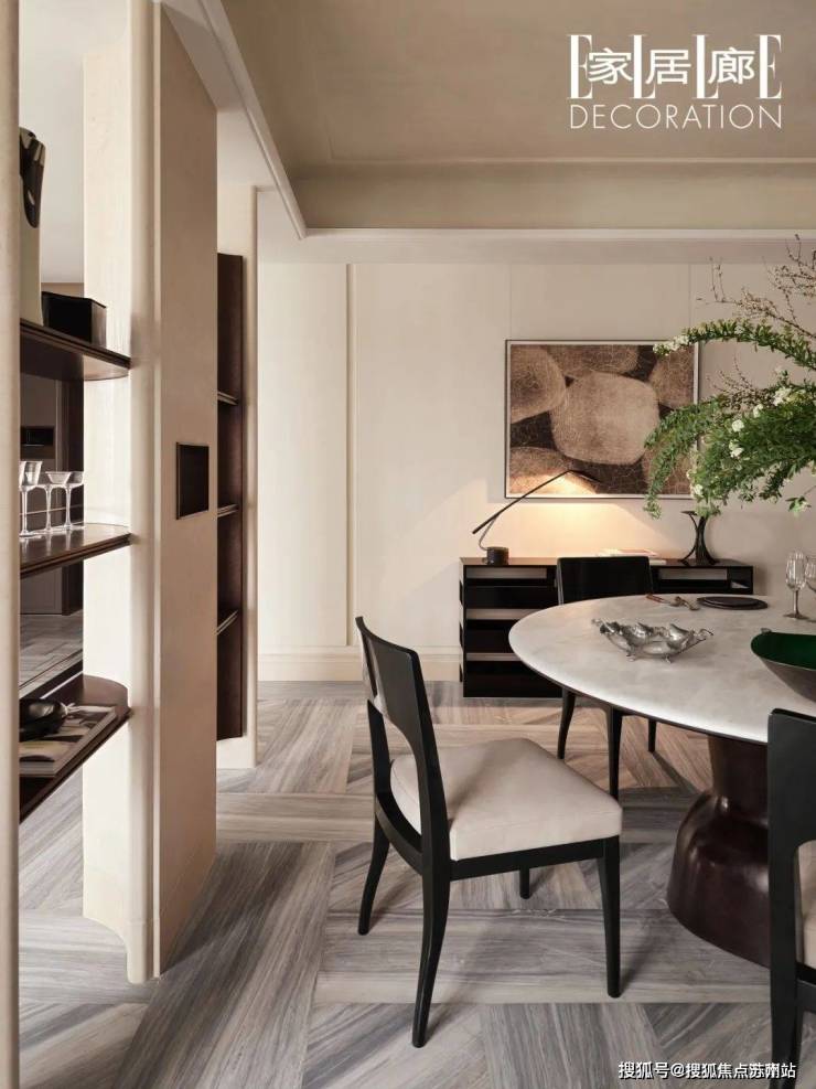 入户的一刻,空间的视觉体验从一个以小型圆桌为焦点的副厅开始。设计团队有意介入黄金十字轴的布局方法,对空间的界限进行模糊和延展处理,最大程度地释放尺度,强调仪式感的同时,制造和引导动线的洄游,让空间相互渗透,形成多义的生活形态。