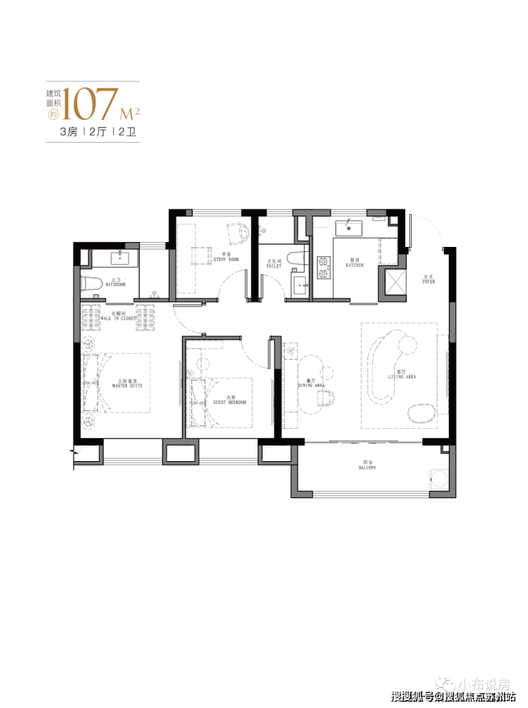 建面约107㎡整体布局与B户型基本一致,最明显的感觉是在尺度上进行了升级。