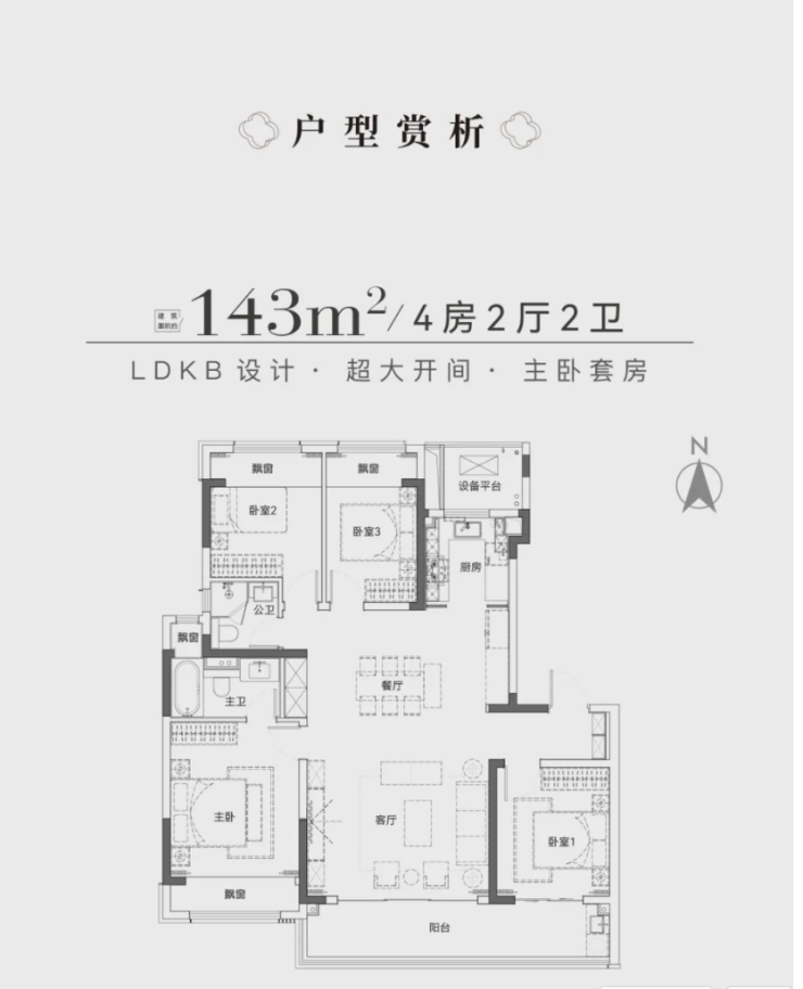 建面约143㎡:四房两厅两卫,LDKB一体化设计,客厅开间大,主卧是带卫生间的套房,功能很全。