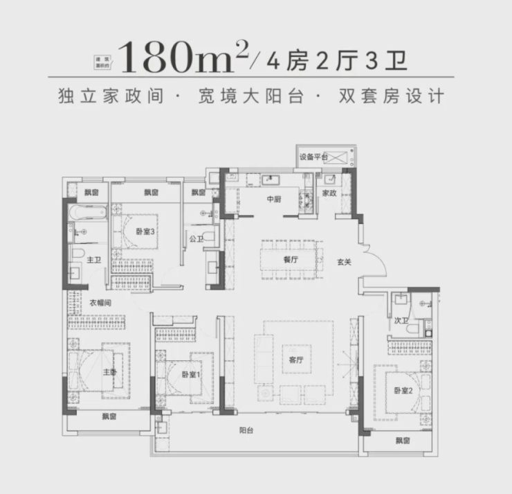 建面约180㎡:四房两厅三卫,除了拥有宽境阳台和双套房,还贴心配置了独立的家政间,生活更加便捷有序。