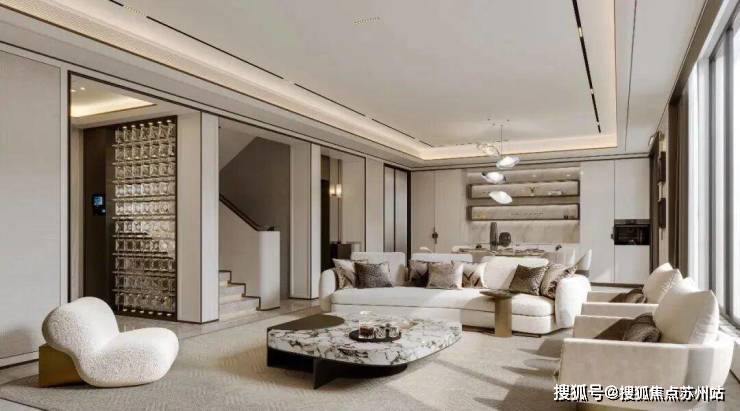 一层是会客区, 约10.7米的超大面宽,阳光、空气可以“肆意”穿过,室内通透明亮。