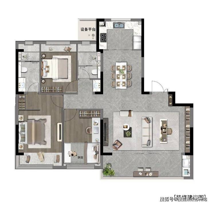 藏峯 | 建筑面积约117㎡苏州户型王 这个户型的亮点是约5.6米尺度级的横厅,搭配约50㎡的客厅聚场,空间感极佳。整体采用酒店式全能空间设计,无论是家庭聚会还是朋友来访,都能提供足够的活动空间。