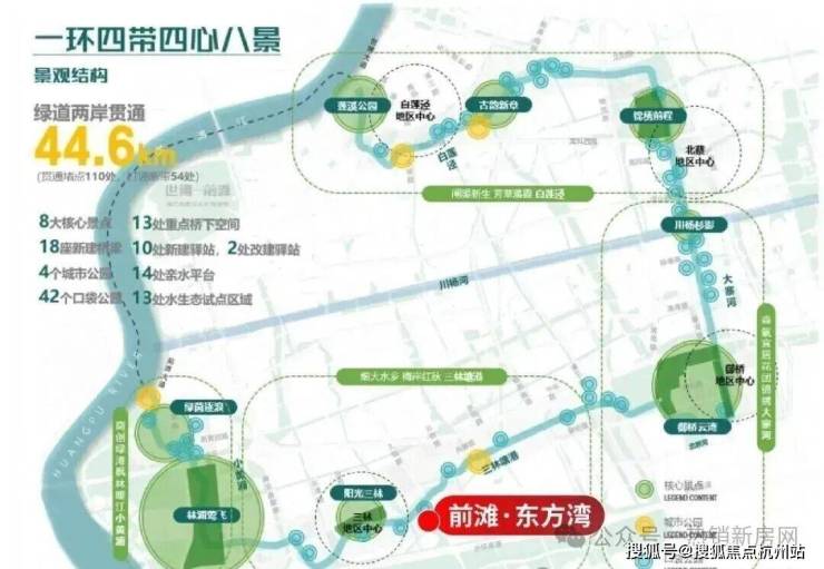 周边前滩友城公园、前滩体育公园、东明公园等已建成公园,三林塘港、“林浦莺飞”、“绿茵逐浪”等核心景点将连缀成片,形成气势磅礴的滨水公园带。