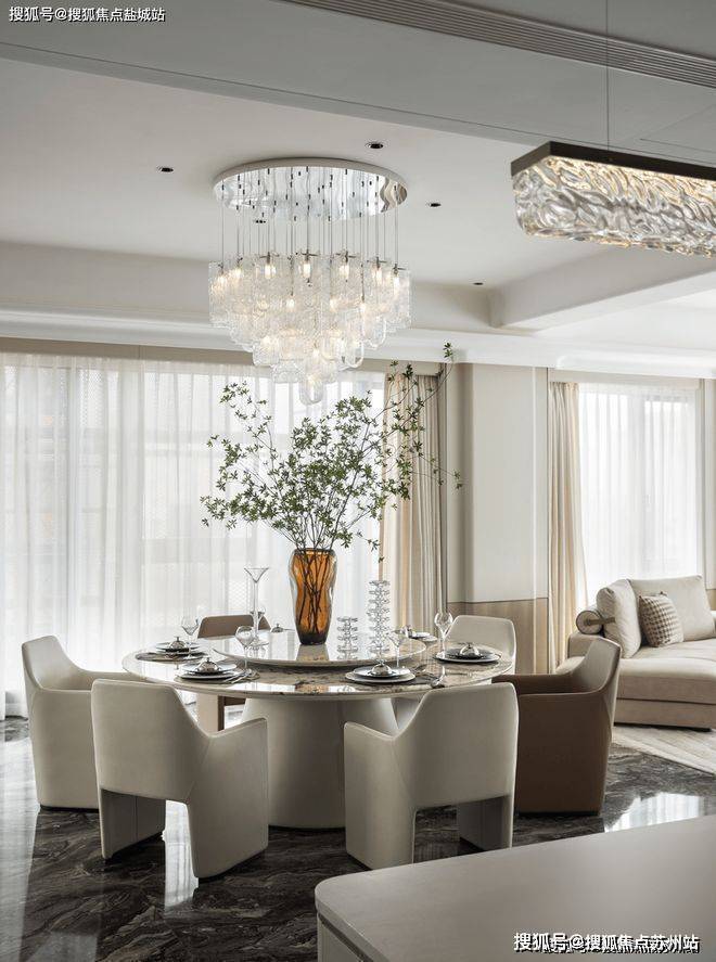 杭州凤咏朝阳售楼处电话☎:400-8828-814(售楼处预约看房热线)餐厅与客厅空间相贯连,开阔的视野带来惬意与更具互动感的用餐氛围。法国餐具品牌Christofle的精巧工艺与大理石水墨画般的自然纹理交相叠映,镜面光泽,熠熠生辉,每一处细节都彰显着对品质生活的极致追求。