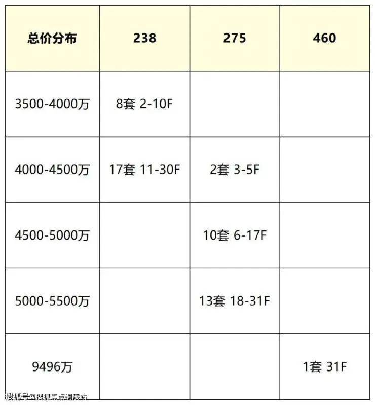 总价方面,3500-4000万的房源有8套,4000-5000万的房源足足有29套,4000万级预算买家上车的概率非常高!