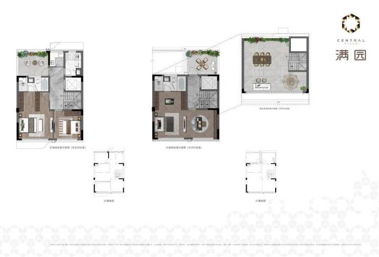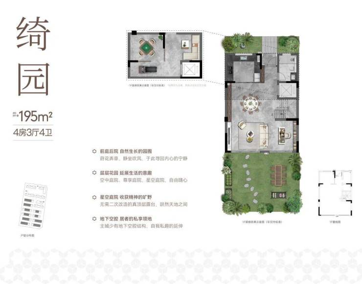 约195㎡联排:同样拥有前庭后院和层层退台的花园设计。空间利用率高,功能齐全,是进入主城别墅生活的优选,总价相对更易触及。
