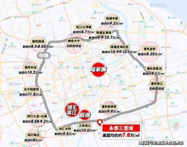 环顾上海中环各大板块,新房价格相续步入9万/㎡+,规划能级更高的热门板块,普遍达到10万/㎡+。