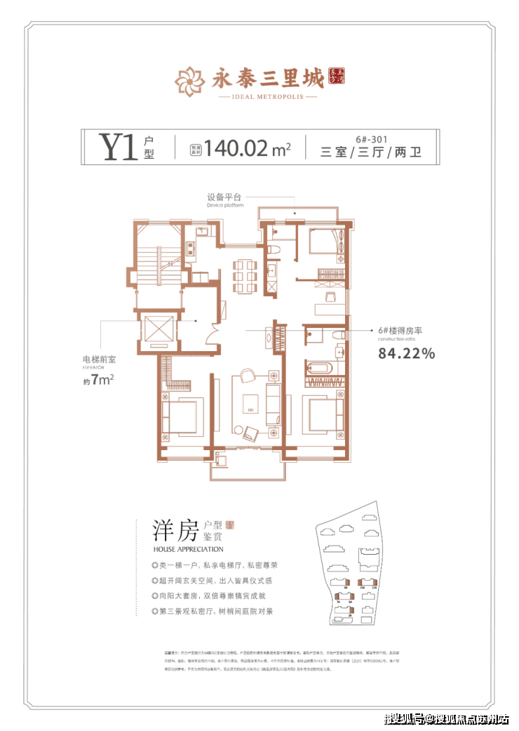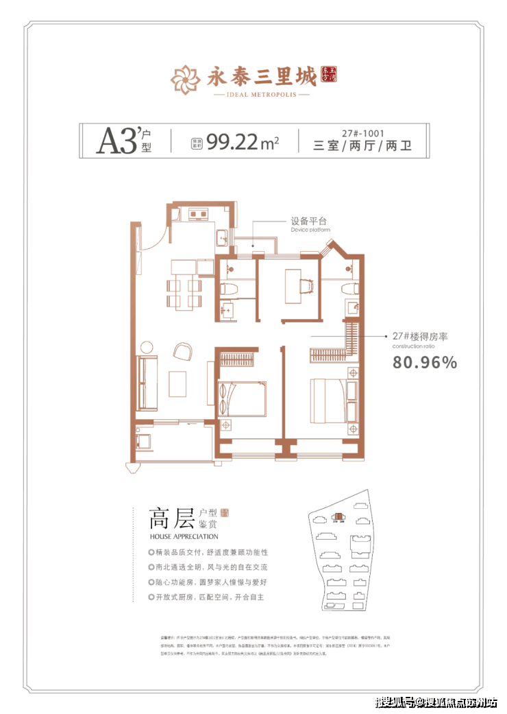 这3个户型三开间朝南、室内“朝南2飘窗+1阳台”、再加上“2卫”、“动静分离”的设计,不管是采光、视野、通风、私密性,还是实用性都十分出色。