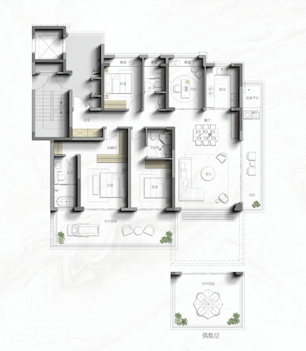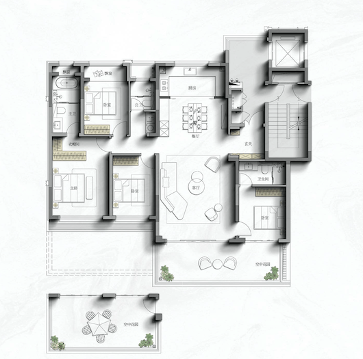四代宅设计,都是带空中花园的!一梯两户的设计,带独立电梯前室,可以用作外玄关或者北花园!
