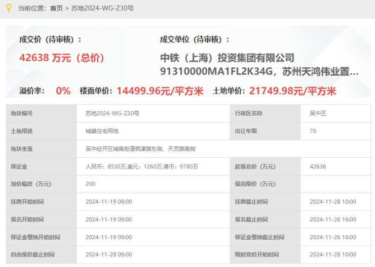 中铁·咏月台,即,苏地2024-WG-Z30号地块项目,位于吴中经开区城南街道枫津路东侧、天灵路南侧,是2024年11月28日,中铁&天鸿伟业以底价42638万元竞得,成交楼面价14500元/平。