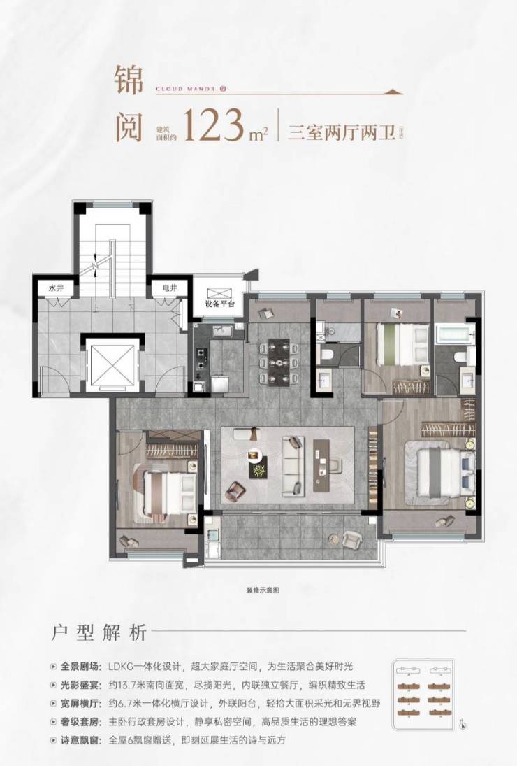关于这个家 ◆所属区域:相城区·虎丘湿地板块 ◆开发商:苏州城投&黄桥国资(双国企) ◆总套数:8栋296户 ◆梯户比:洋房(一梯两户) 小高层(一梯一户) ◆物业公司:城投物业 ◆物业费:296户 ◆得房率:洋房80% 小高层75-78% ◆车位配比:1:1.6(停车位482) ◆容积率:约1.6 ◆绿地率:约38% ◆楼间距:25-30米左右 ◆产权年限:70年 ◆装修配置:精装修(三大件) ◆交房时间:2026年6月-12月 ◆在售面积: 1、洋房:123㎡(6-7F) 2、小高层:118㎡和143㎡(17F)