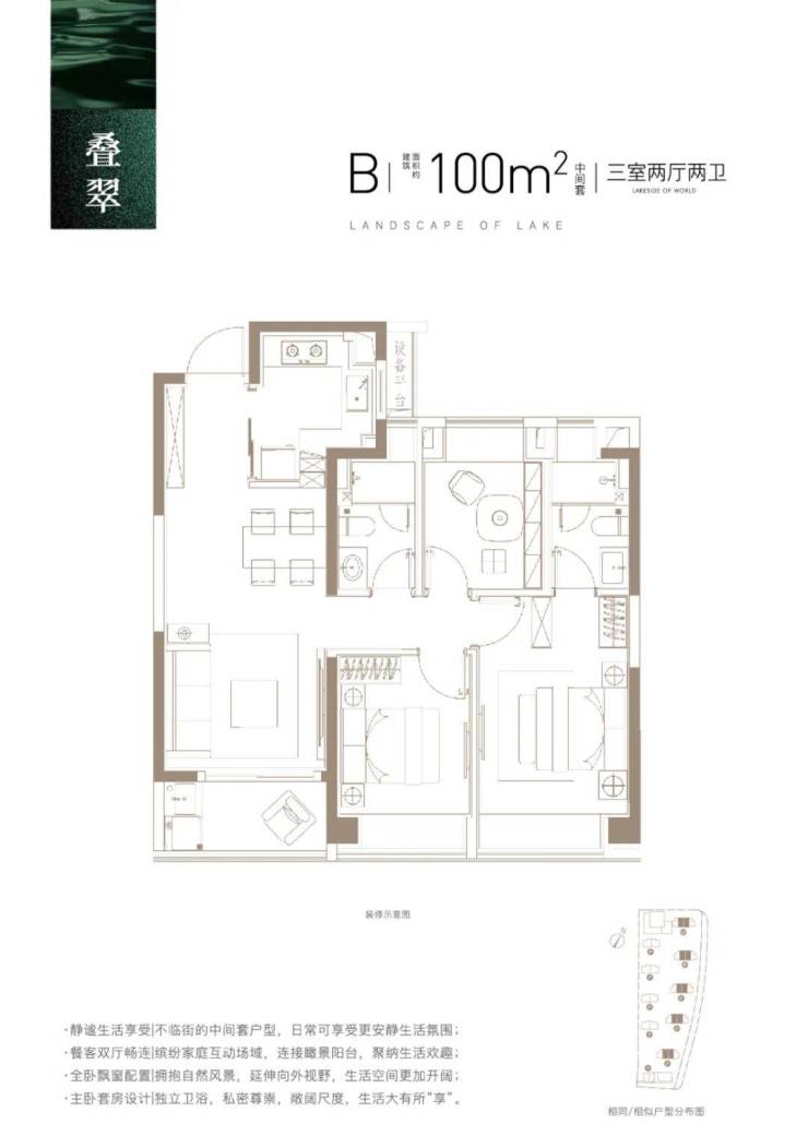 建面约100㎡3房2厅2卫,功能性和尺度感完美结合的3房户型。