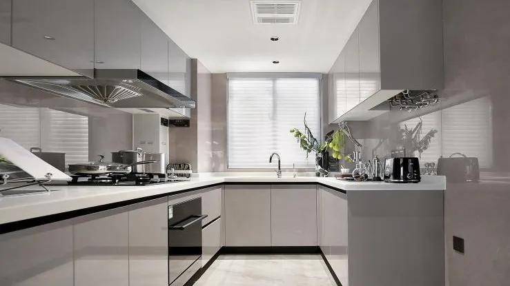 厨房空间,采用铝合金玻璃PVC饰面的免漆门套及铝合金移门,三件套使用老板的油烟机、燃气灶、洗碗机交付,更有摩恩的水槽和龙头、定制的组合橱柜。