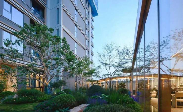 第一进:星级酒店的入户门头搭配入户水景,让入户更具仪式感、同时通过院内布景的遮挡,让小区内部景观增添一抹神秘感;