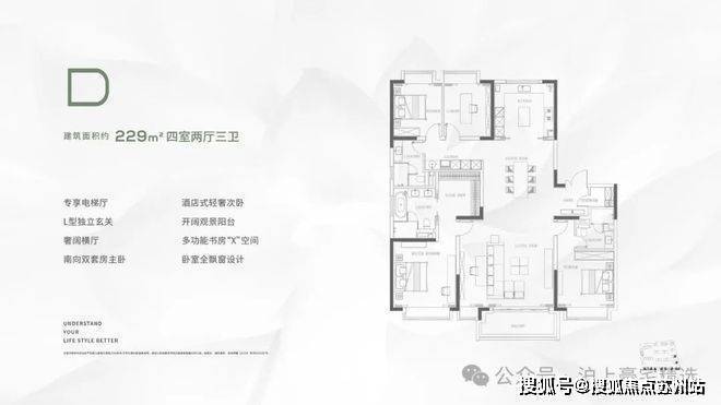 4室2厅4卫:建筑面积约229㎡,该户型在功能分区上更加细致,四个卫生间的配置让每个卧室都能享受到相对独立的卫浴空间,极大地提高了居住的舒适度和私密性,同时也方便了家中有老人或小孩的家庭,避免了使用卫生间时的不便。