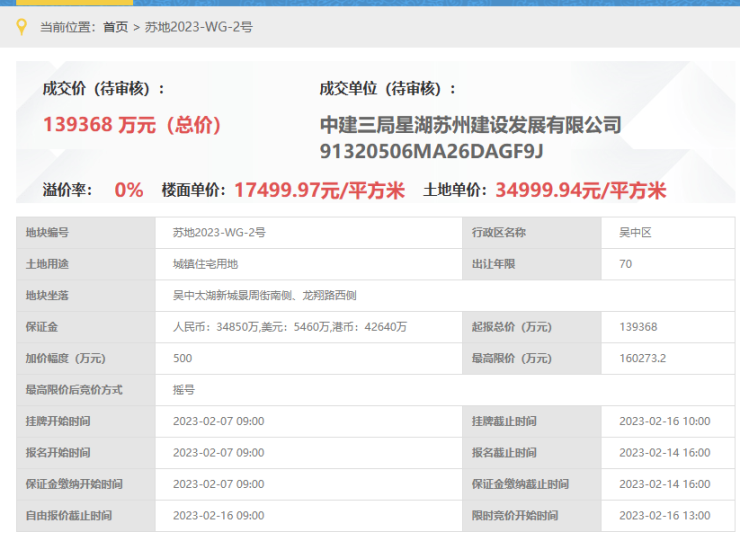 中建太泽之星|藏湖,即,苏地2023-WG-2号地块,位于吴中太湖新城景周街南侧、龙翔路西侧,是2023年2月16日,中建三局以底价139368万元竞得,成交楼面价17500元/平。