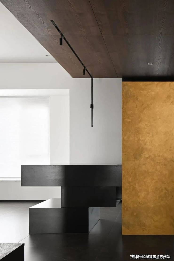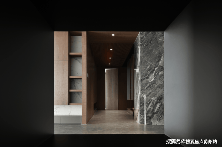 克制的材质使用和通顶的隐形门让走廊维持着外在的简约,格栅的肌理和大理石的纹路交织,悬挑和挖空带来错落的结构感,都丰富着空间的细节和层次。