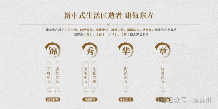 建发房产基于王府中式、盛世唐风、禅境中式、风雅宋韵、海派东方、诗意东方等多元产品风格,凝练为【锦】、【秀】、【华】、【章】四大产品系列。