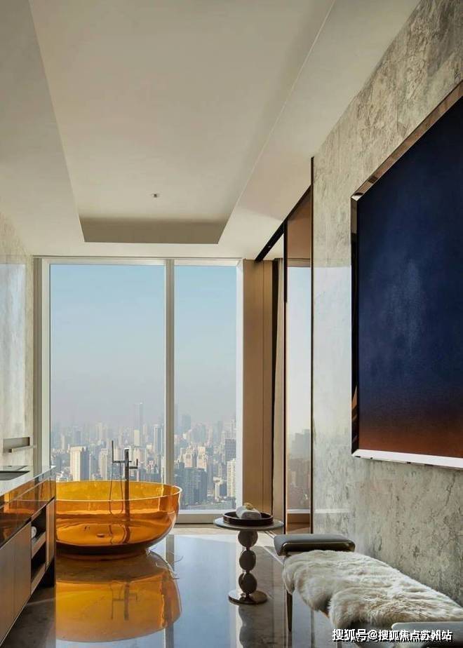 走道端处香槟色金属雕塑,形类城市高楼,又若恋人彼此依偎;全采光套房拥揽白日上海黄浦的忙碌、繁华,也收藏夜晚灯火阑珊的宁静、美好.