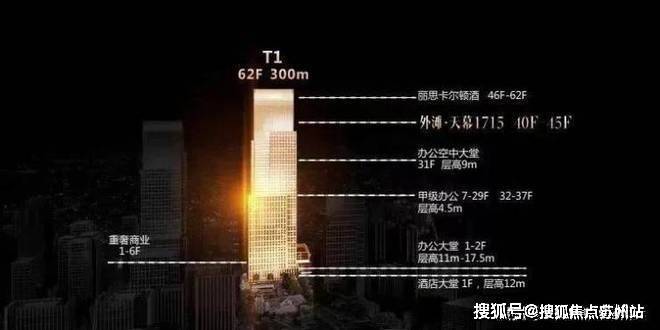 T1-300米超高层塔楼上部46-62层为五星级酒店(丽思卡尔顿)、38,40-45层行政公馆,中部7-37层为甲级办公,底部为商业及大堂.