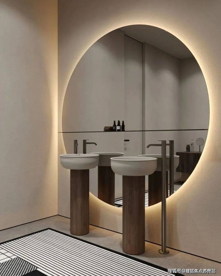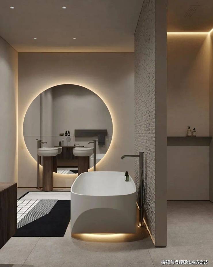 卫生间中,设计师选用灰白色作为空间的主色调,营造出一种舒适的轻盈感。圆形的镜面,让空间更显柔和与开阔。镜面背后的暖色灯光增添了空间的温馨质感。
