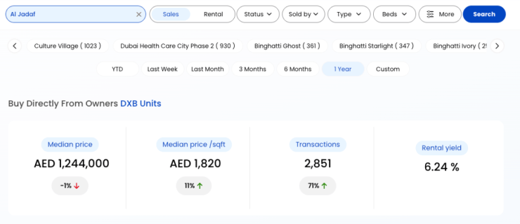 AlJaddaf区域的房产市场呈现出“量价分化、价值凸显”的鲜明特征:过去一年,区域中位数房价为124.4万迪拉姆,虽同比微降1%,但每平方英尺中位数价格逆势上涨11%至1820迪拉姆,交易总量达2851笔,同比激增71%,租金回报率稳定在6.24%。这种“交易量爆发+单价上涨”的格局,既体现了区域永久产权政策释放的市场活力,也印证了AlJaddaf作为迪拜核心区与新兴板块枢纽的价值潜力——随着立体交通与醇熟配套的持续落地,其资产的稀缺性与增值预期正不断强化,成为刚需与投资客群布局迪拜核心资产的优选板块。