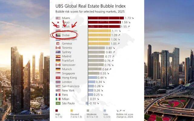 根据瑞银集团的《2025年全球房地产泡沫指数》,迪拜的得分确实进入了“风险升高”类别 (1.09),他们认为迪拜房价走势已脱离了家庭收入水平。